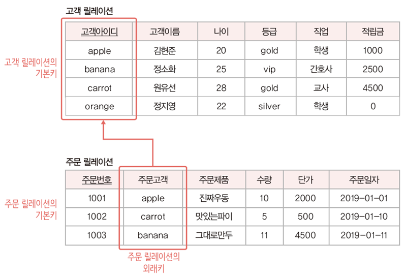 - 외래키(Foreign Key): 어떤 릴레이션의 애트리뷰트 혹은 애트리뷰트의 집합이 다른 릴레이션의 기본 키가 되는 키.