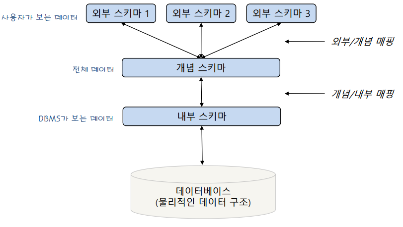 - 외부 스키마: 각 사용자들이 데이터베이스에 접근할 때 사용하는 데이터의 논리적 구조를 정의한다. 하나의 데이터베이스에는 여러개의 외부 스키마가 있을 수 있다. 전체 데이터베이스의 일부분이라고 볼 수 있으며 이러한 점 때문에 서브 스키마라고도 한다.