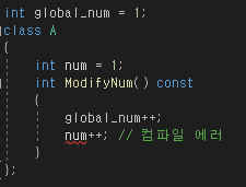멤버 함수를 const화 하면 해당 멤버 함수 내에서는 모든 멤버 변수를 const화 하였다고 판단하게 된다. 해당 멤버변수 내에선 어떠한 멤버 변수도 변경할 수 없다.(지역 변수는 가능)
