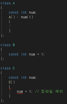 const 키워드를 사용할때는 반드시 초기화를 해주어야 한다. 멤버 변수를 const로 선언할때는 아예 선언과 동시에 초기화를 해주거나, 초기화 리스트를 사용하여야 한다.