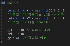 const가 포인터 변수 앞에 있을때: 해당 포인터가 가르키는 값을 const화.
