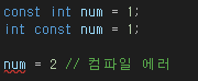 두 선언은 동일하며, num은 const int로 변하지 못하는 상수가 되어서 num을 변경하려고 하면 에러가 발생.