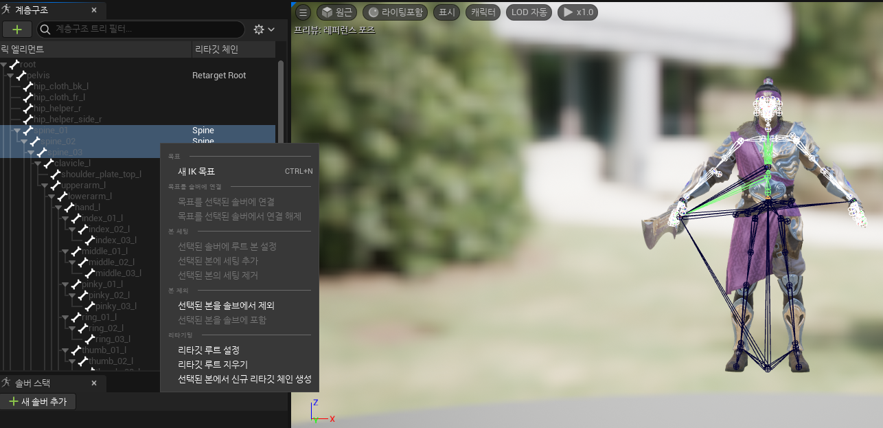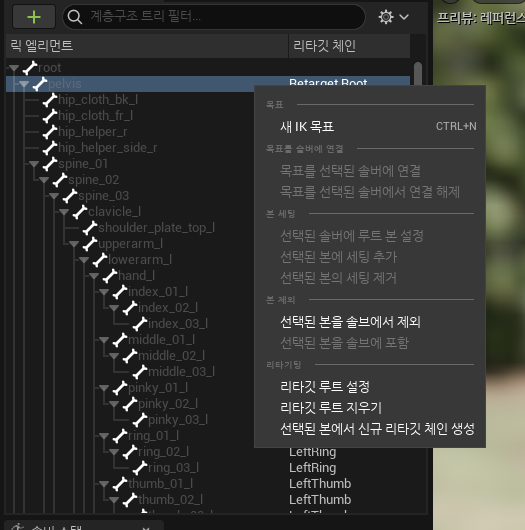 리타깃 루트를 설정해줘야 하는데 이 때 루트본이 아닌 골반(Pelvis)본을 리타깃 루트로 설정해준다.