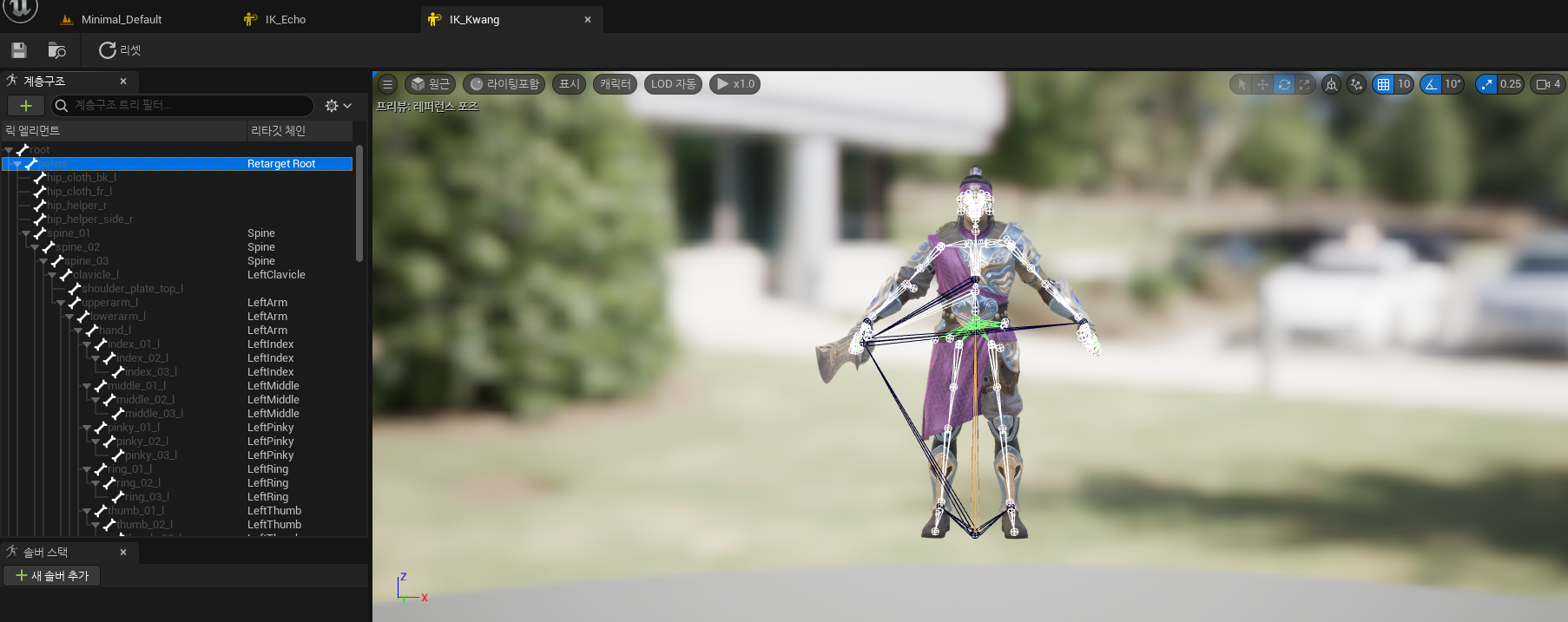 Kawng 스켈레탈 메시의 IK 릭 파일에서 생성한 리타깃 체인들이다.
