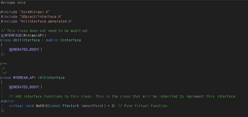 이렇게 만든 언리얼 인터페이스는 사용하고자 하는 C++ 클래스에 상속시켜주면 된다.