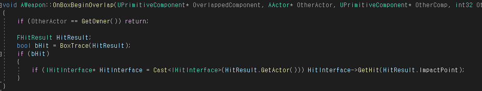 무기의 오버랩 이벤트가 발동할때 오버랩된 액터의 GetHit이라는 함수를 호출하여 오버랩에 반응하도록 하고싶다고 가정해보자.