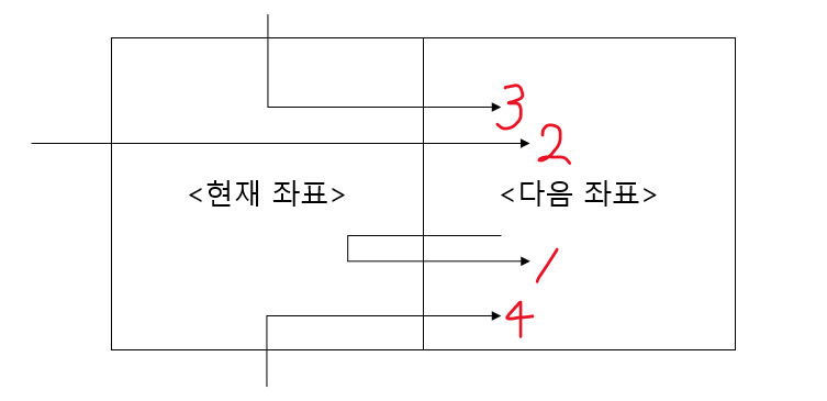 > 현재 좌표로 들어온 방향(북, 남)과 다음 좌표에서 들어온 방향(서)이 동일하지 않음